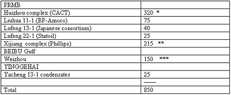 Of the fields above, the Huizhou complex produces 90,000 bd and the Xijiang complex 75,000 b/d. Current oil production is 250,000 bd (it has reached 282,000 b/d in 1997) and is expected to decline unless further commercial discoveries are made.