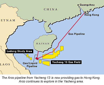 Chevron is reviewing these results while Arco does not seem to have any plan for exploration. Arco had entered into an agreement with CNOOC to study the feasibility of developing two fields, Ledong 22-1 and its satellites possibly for gas supplies to Hong Kong and Wenchang 19-1, an oil discovery relinquished by Esso. Ledong 22-1 is located west of Hainan in the Qingdongnan Basin, while Wenchang 19-1 is located some 38 km to the southeast of the gas pipeline midway between Yacheng 13-1 and Hong Kong. No report has been made on the results of the study on the Ledong 22-1 Field and satellites. A report that CNOOC would develop Wenchang 19-1 on its own, seems to indicate that Arco has renounced to join into the project.