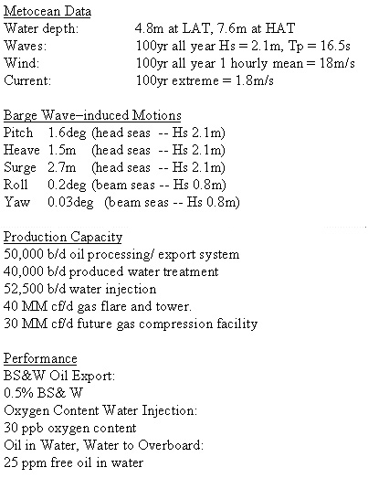 For a number of reasons including; safety of repeated offload operations in shallow ‘inshore' waters, operational and conversion costs, schedule, local support infrastructure and local contract requirements (NNPC), Brass opted to proceed with the barge mounted production facility. A number of deviations to this option were proposed including crude storage and the inclusion of gas treatment and compression facilities. However an export route to the nearby OPL98 block FPSO was negotiated releasing the requirement for onboard storage and the decision for gas compression was partially executed as a design only case, with the facilities themselves scheduled for installation in the future.