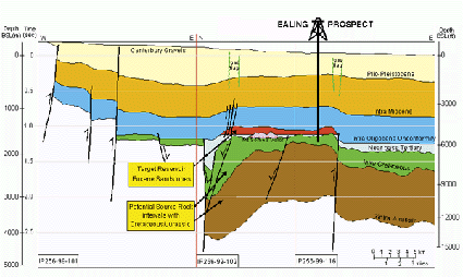 In the south of the permit area, the Ealing Prospect has been mapped as a potential trap over an area of about 15,000 acres. Due to its greater separation from the Alpine Fault (New Zealand's analog to California's San Andreas Fault) it has not been subject to the same degree of structuring as Arcadia. However, its expansive area and likely good quality reservoir development in the Homebush Sandstone Formation, combined with the evidence of hydrocarbon gas flags adjacent to the main fault that bounds the Ealing structure, make it a desirable exploration target.