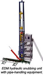"[Snubbing units] are used in situations such as when you are off bottom with drill pipe and you take a kick in the hole, particularly in an oil mud where the kick is not going to migrate so you have to get the pipe back to bottom," explained Larry Flak, Engineering Manager of well control specialists and well firefighters, Boots & Coots.