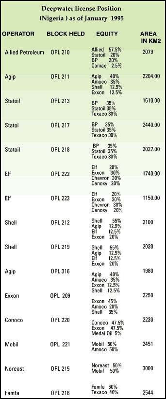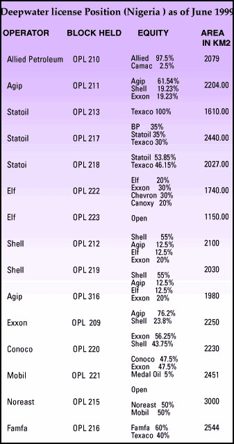 The results of all this drilling activity has led to re-arrangement of the ownership-equity pattern. The BP/Statoil alliance broke down last year after five consecutive wells in four leases failed to yield more than oil or gas shows. BP was preparing to leave Nigeria even before its merger with Amoco, so by the time Statoil discovered Nnwa (est 500 million bbl oil), in OPL 218, BP had pulled out of the partnership. Expectedly, Texaco, as third partner, exercised its rights and now holds 46.15% to Statoil's 53.85%. BP and Statoil have relinquished their stakes in OPL 213. Texaco now holds a 100% stake in the lease and has become operator.