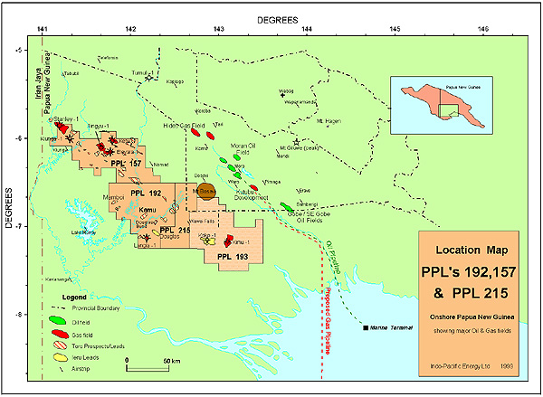 Adjacent to Indo-Pacific's PPL 215, in PPL 193, Oil Search now proposes to reappraise its Kimu discovery which has the potential to flow at 50 million cf/d gas. Permits such as PPL 192 and PPL 215 in the Foreland area of PNG could also supply gas to Australia via the proposed pipeline, thus adding value to Indo-Pacific's Papua New Guinea holdings.