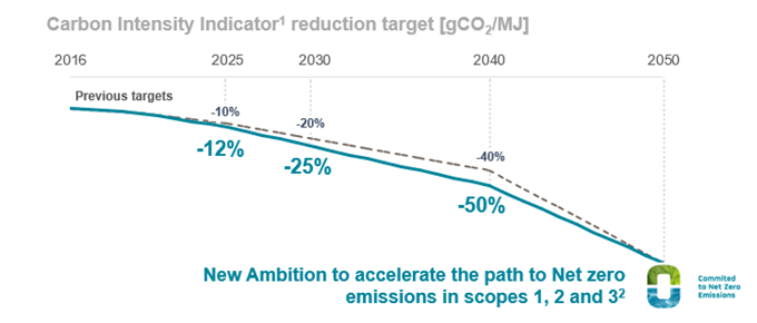 The Strategic Plan 2021-2025 outlines new and more ambitious emissions reduction targets. It aims at a reduction of the carbon intensity by 12% in 2025, 25% in 2030, and 50% in 2040, compared with the previously set objectives of 10%, 20%, and 40%, respectively.