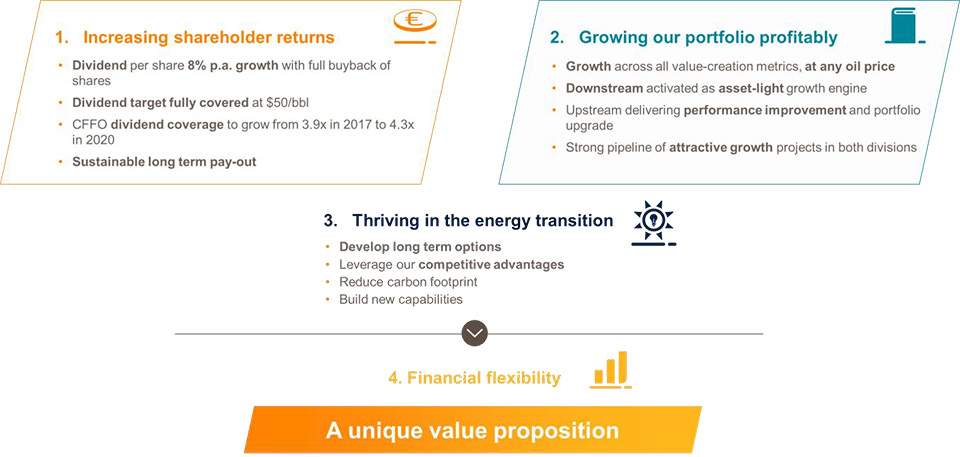 - The renewed strategy is based on three pillars: increasing shareholder distribution; profitable business growth (Upstream and Downstream); and the development of new businesses linked to the energy transition.