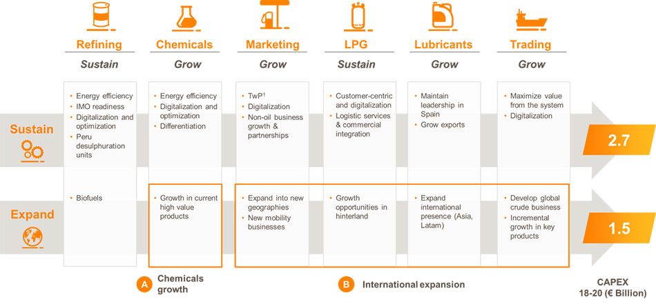 - Between 2018 and 2020, Repsol plans to invest 15 billion euros: 53% in its Upstream unit (Exploration and Production) and 45% in Downstream (Refining, Chemicals, Marketing, Lubricants, Trading, LPG, Gas & Power) and low-emissions assets.