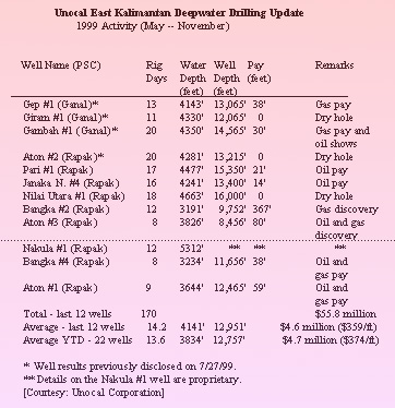 Unocal has drilled 12 deepwater wells in the Kutei Basin since June. Those 12 wells were drilled for an average cost of $4.6 million, with an average drilling time of 14.2 days. (Details of the individual well results are shown in the attached table.)