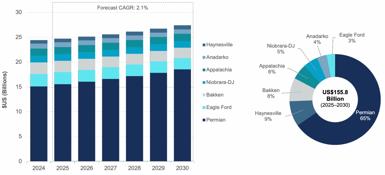 Over the next five years, US$16Bin capital expenditures is projected for water-related infrastructure—including pipelines to reduce reliance on trucking, disposal wells facing regulatory scrutiny, and recycling facilities to enable reuse at scale. Collectively, investments in these assets represent a strategic pivot toward efficiency, positioning operators to lock in long-term cost advantages while addressing environmental and regulatory requirements.