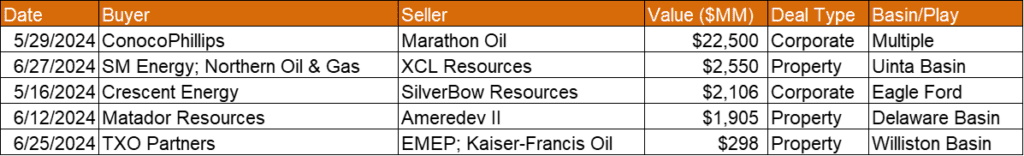“M&A momentum carried into the second quarter as pressure built on companies like ConocoPhillips, Devon Energy and SM Energy, that had previously stayed out of the market to keep pace with peers and grow in scale,” said Andrew Dittmar, principal analyst at EIR. “In the case of ConocoPhillips and Devon Energy, running out of inventory doesn’t appear to be as high a concern, but there is still a perception that successfully navigating the maturing phase of shale requires building resource base with M&A.”As seen in Q1, when Diamondback Energy purchased Endeavor Energy Resources, M&A value in Q2 was heavily weighted toward one large transaction with ConocoPhillips acquiring Marathon for $22.5B. The deal, which is the fifth largest U.S. upstream deal of the last decade, is another historic name exiting the E&P space as Marathon Oil has roots that reach back more than 100 years. Unlike most other big deals in the current consolidation cycle that focused entirely on the Permian Basin, Marathon Oil held a diversified asset base that included Permian exposure along with large positions in the Eagle Ford and Williston Basin.