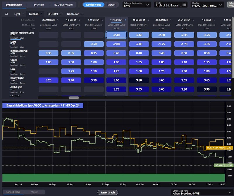 There are two things to note on the crude side. The first is that with trans-Atlantic freight actually picking up again, WTI remains expensive in NWE. Even VLCCs are landing on par with Forties for early December.